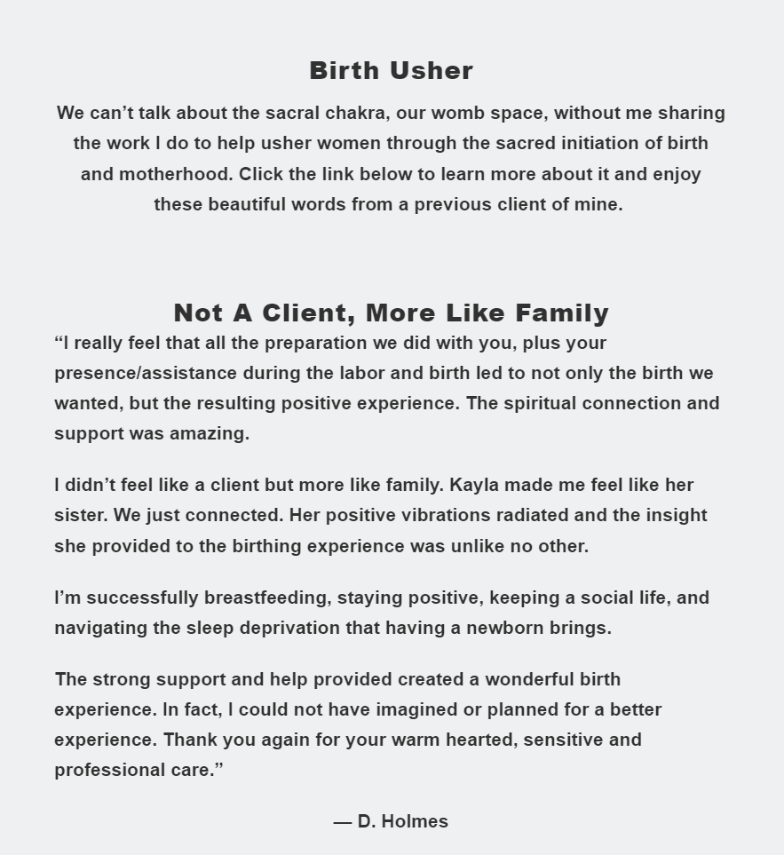 I hope this email finds you emersed in self-love. May you experience the love of God as you, through you, and to you. I supported a birth last weekend and it’s timely given we are beginning our journey through the sacral chakra, our energy center that deals with creation, self-expression, and pleasure. It’s our womb space and the true seat of our emotions. The place where all of our energy is stored. Are you ready to unlock a new depth of yourself?
